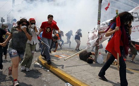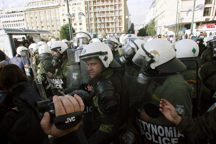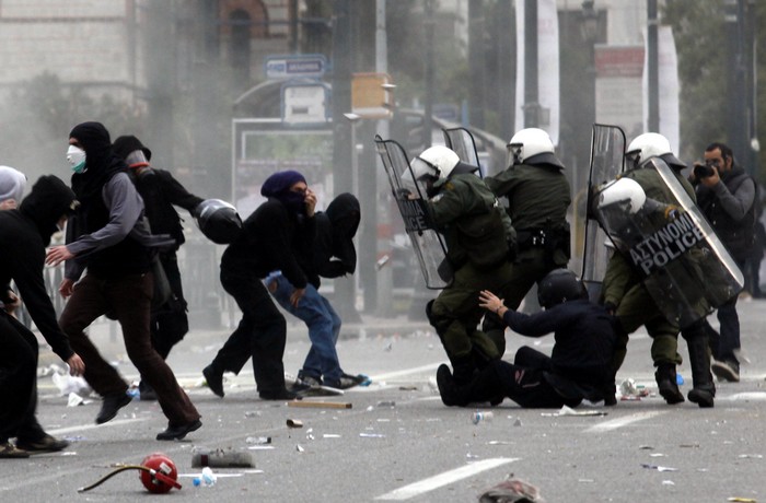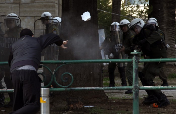 Ακολουθεί πετροπόλεμος με τα ΜΑΤ μπροστά στο κτήριο της Βουλής και επίθεση των δυνάμεων καταστολής στον γενικό όγκο της πορείας.