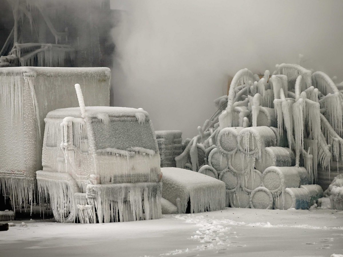 Πυροσβέστες προσπαθούν να σβήσουν μια πυρκαγιά που μαίνεται σε μια αποθήκη στο Σικάγο στις 23 Ιανουαρίου. Το τσουχτερό κρύο παγώνει όλη την περιοχή