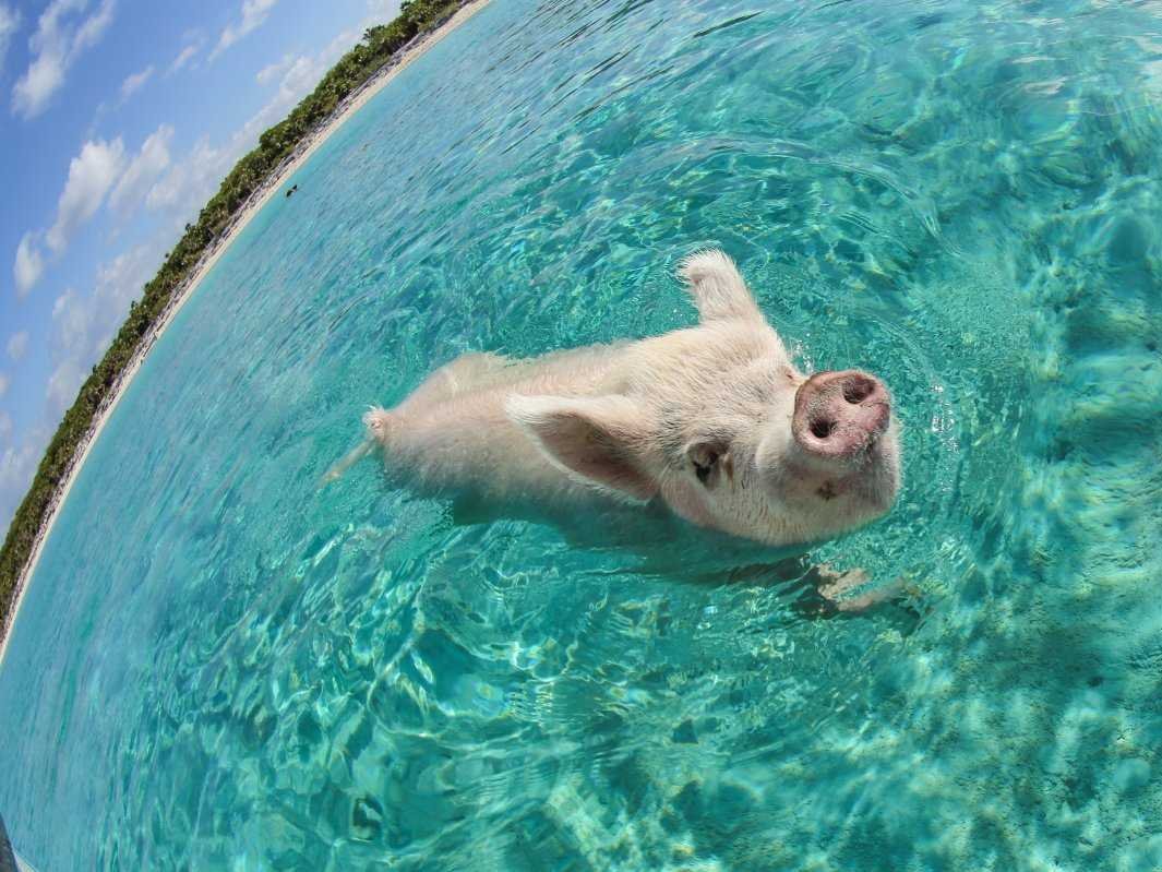 Χοίρος κολυμπά στο Big Major Cay στις Μπαχάμες