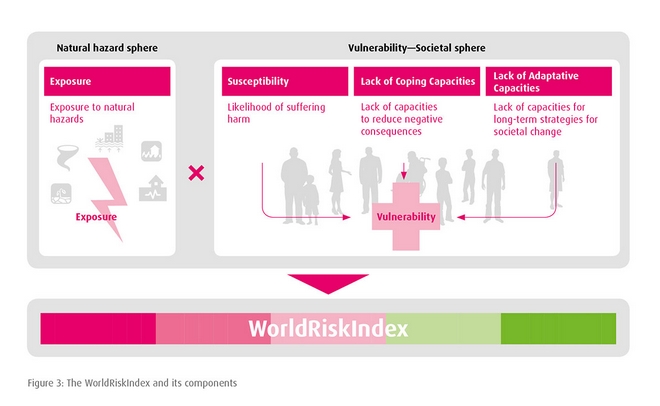 Στις πρώτες θέσεις της λίστας κατατάσσονται χώρες που βρίσκονται σε περιοχές που αντιμετωπίζουν, ήδη, μεγαλύτερες απειλές για κάποια καταστροφή λόγω της γεωγραφικής τους θέσης, όπως η Χιλή, που βρίσκεται σε μια σεισμογενή περιοχή. Παράλληλα, υψηλό κίνδυνο αντιμετωπίζουν και οι χώρες που δεν διαθέτουν ικανές υποδομές για την αντιμετώπιση μιας έκτακτης ανάγκης, όπως πολλά κράτη της Αφρικής.