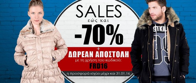 Κουπόνι για δωρεάν μεταφορικά σε όλες τις παραγγελίες, με τη χρήση του κωδικού FRD16. Βρείτε ρούχα με εκπτώσεις έως 70%. Η προσφορά ισχύει έως 31/01.