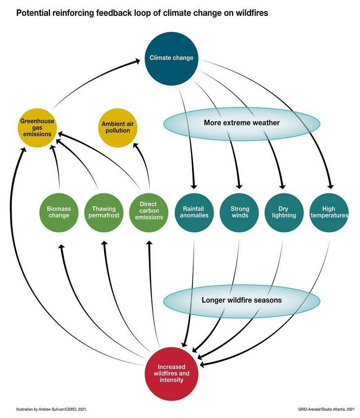 «Η κλιματική αλλαγή και οι πυρκαγιές αλληλοενισχύονται (βλ. το παρακάτω διάγραμμα) και οι πυρκαγιές που καίνε σήμερα σε πολλά μέρη του κόσμου είναι μεγαλύτερες (Σιβηρία, Αυστραλία, Λατινική Αμερική, ΝΑ Ασία), πιο έντονες και διαρκούν περισσότερο από ό,τι παλαιότερα», συνεχίζει ο κ. Τζερίτης.