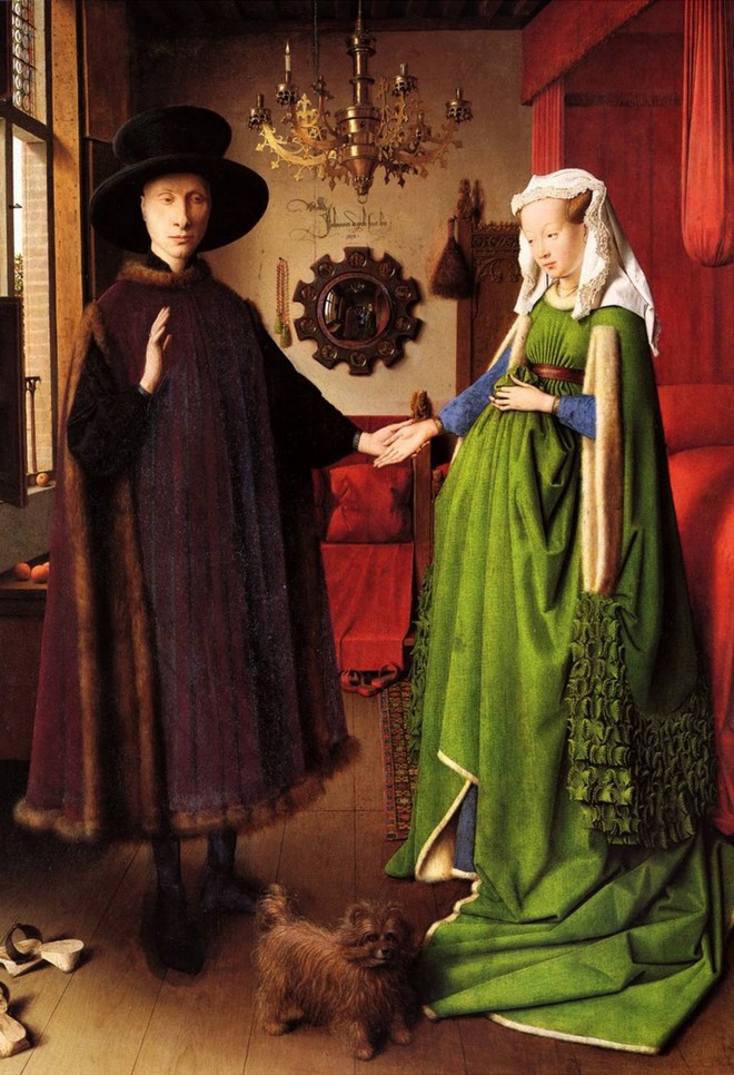 Ο ζωγράφος Jan van Eyck ακολουθώντας ένα μοτίβο του 20ου αιώνα γράφει το όνομά του στον τοίχο πίσω από το ζευγάρι.