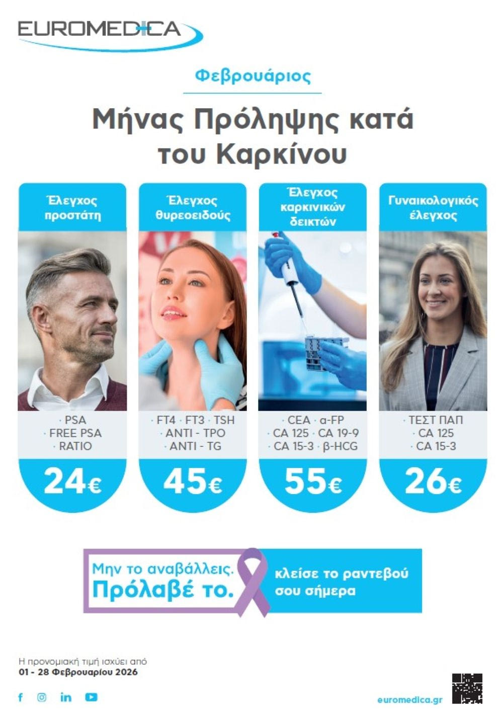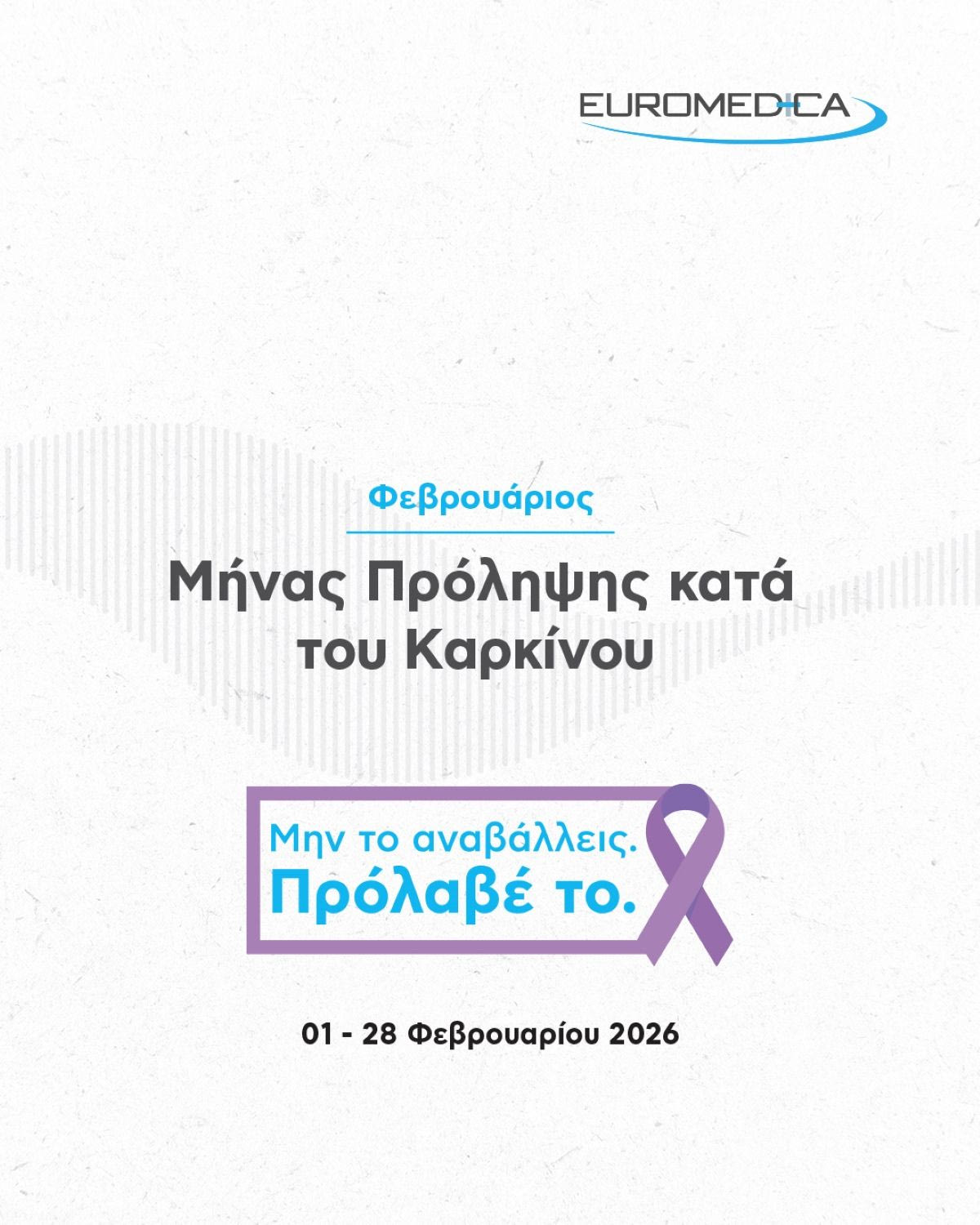 Για ολόκληρο τον μήνα Φεβρουάριο, η Euromedica προσφέρει σε προνομιακή τιμή τέσσερα ολοκληρωμένα πακέτα προληπτικών εξετάσεων για τον καρκίνο, τα οποία έχουν σχεδιαστεί βάσει διεθνών ιατρικών κατευθυντήριων οδηγιών και καλύπτουν βασικούς τομείς προληπτικού ελέγχου για άνδρες και γυναίκες.