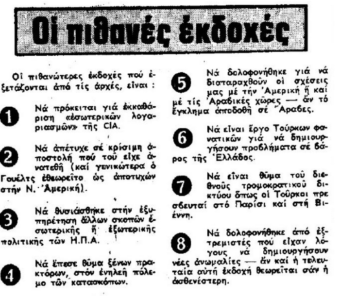 Στις 24 Δεκεμβρίου 1975, η εφημερίδα “Τα Νέα” κυκλοφόρησαν με πρωτοσέλιδο “Μεγάλη προβοκάτσια, τρεις μελαψοί ξένοι, σύμφωνα με όλες τις ενδείξεις, εξετέλεσαν τον αρχηγό της CIA”.