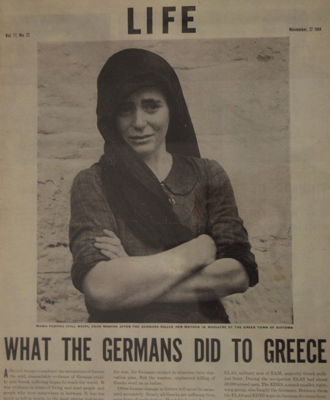 Με την έλευση του Νοέμβρη του 1944 , στο Δίστομο έφτασε και ο ανταποκριτής του αμερικανικού περιοδικού “Life”, Ντμίτρι Κέσελ φωτογραφίζοντας σπίτια, πλατείες και πρόσωπα, μεταξύ αυτών και τη Μαρία Παντίσκα, μία κοπέλα που δεν είχε συμπληρώσει καλά-καλά τα 19 της χρόνια. Με ανασηκωμένα μανίκια αφού λίγο νωρίτερα έπλενε στη σκάφη, νεανικό πρόσωπο αλλά “γερασμένη” από το κλάμα όψη, η φωτογραφία της ήταν η ακριβής απεικόνιση που έψαχνε ο ανταποκριτής για να συνοδεύσει το άρθρο με τίτλο “What the Germans did to Greece”, το οποίο δημοσιεύτηκε στο “Life” στις 27 του ίδιου μήνα. Αρκετά χρόνια αργότερα, η φωτογραφία αυτή έγινε σύμβολο παγκόσμιας εμβέλειας της σφαγής και η Μαρία Παντίσκα (απεβίωσε το 2009) έμεινε γνωστή και ως “Γυναίκα του Διστόμου”.