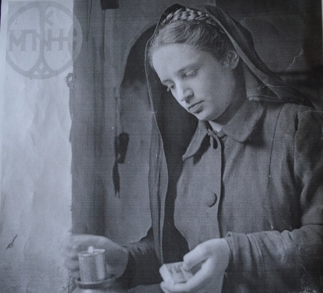 “Όταν είχε έρθει ο Κέσελ στο χωριό, η μητέρα μου ήταν στην αυλή και έπλενε στη σκάφη. Γι’ αυτό έχει και σηκωμένα τα μανίκια και είναι και βρεγμένα, φαίνεται αν το προσέξεις. Τότε, αρκετούς νεκρούς τους είχαν θάψει πολύ κοντά στα σπίτια ή και στις αυλές ακόμα. Εκεί κοντά στο σπίτι της υπήρχε ένας κήπος και είχε αφήσει τη σκάφη για να πάει να ανάψει τα καντήλια. Εννέα καντήλια ήταν. Καθόταν εκεί και μοιρολογούσε. Ο Κέσελ που γύριζε το χωριό και φωτογράφιζε την είδε. Μου είπε ότι όπως έκλαιγε ένιωσε κάποιο χέρι να την χτυπάει στον ώμο. Της είπαν, Μαρία αυτός είναι φωτογράφος έχει έρθει και φωτογραφίζει, αν θες να σε βγάλει κι εσένα. Η μαμά μου δέχτηκε. Το μόνο που έκανε ήταν να της ρίξει το μαντίλι πιο πίσω για να φαίνεται το πρόσωπό της. Την έστησε μπροστά σε έναν τοίχο που υπάρχει μέρι σήμερα και την έβγαλε φωτογραφία. Της είχε μείνει ολοζώντανη αυτή η στιγμή για χρόνια. Όταν δημοσιεύτηκε, της την έστειλαν σε γράμμα. Την είχε τη φωτογραφία από το 1945″.