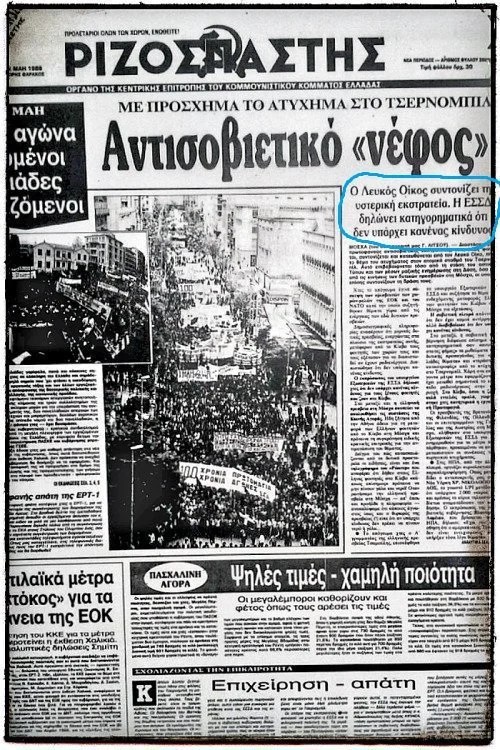 Το πρωτοσέλιδο του Ριζοσπάστη αναδεικνύει το γεγονός πως το ΚΚΕ και η Σοβιετική Ένωση υποβάθμιζαν τον κίνδυνο, ή αν θέλετε, απαντούσαν στα αντίστοιχα “δυτικά” πρωτοσέλιδα.