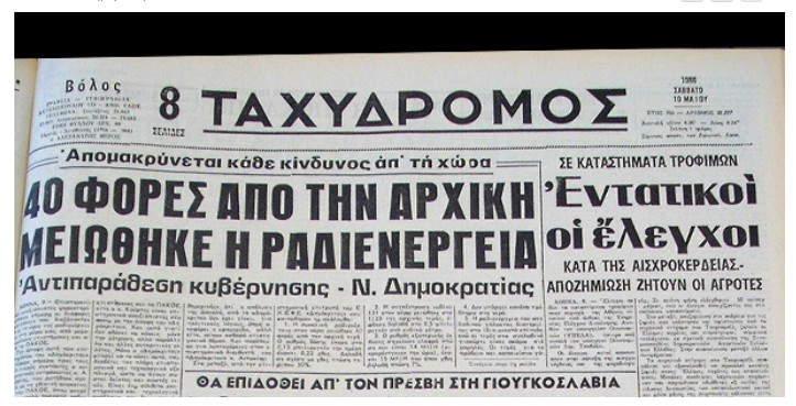 H πολιτική αντιπαράθεση της εποχής ανάμεσα σε ΠΑΣΟΚ και ΝΔ αποτυπώνεται και στο πρωτοσέλιδο του Ταχυδρόμου του Βόλου (10 Μαΐου του 1986). Γίνεται αναφορά και στις ομιλίες επιστημόνων σε δημαρχεία και σχολές, με τις απόψεις που διατυπώνονταν τότε να είναι αντικρουόμενες.