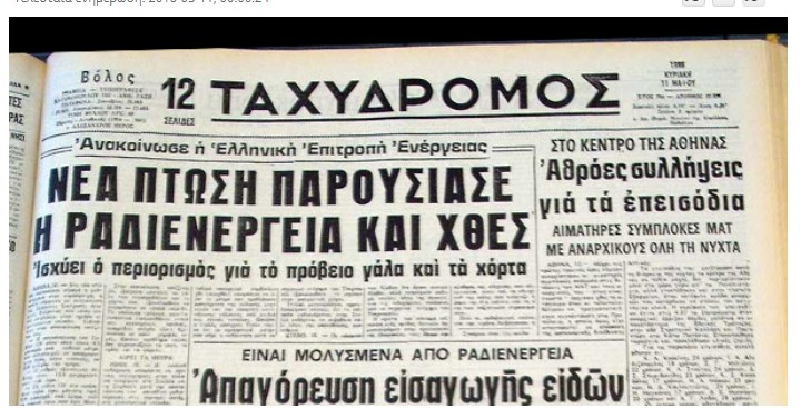 Δείτε και το πρωτοσέλιδο της 11ης Μαΐου από την ίδια εφημερίδα. Εδώ έχουμε την ανακοίνωση της Ελληνικής Επιτροπής Ενέργειας η οποία καθησύχαζε τον κόσμο, ενώ καταγράφονται και τα επεισόδια με τις συμπλοκές σε πορεία που έγινε σχετικά με τα πυρηνικά από αριστεριστές και αναρχικούς.