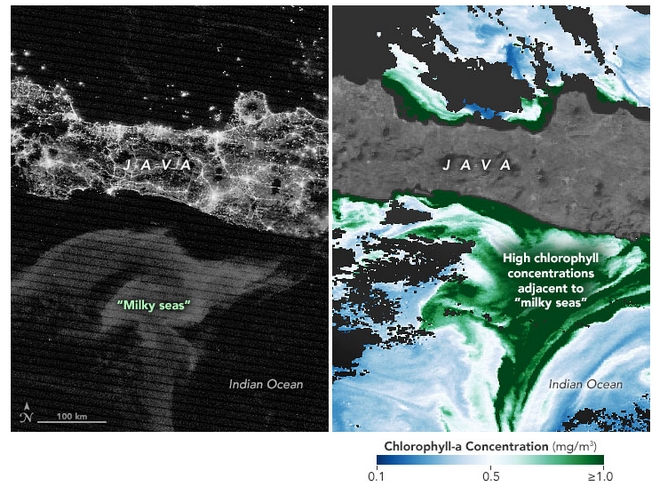 Το όργανο VIIRS στον δορυφόρο NOAA-NASA Suomi NPP απέκτησε την εικόνα στην Ιάβα και των γύρω θαλασσών στις 4 Αυγούστου 2019. Στη μεγαλύτερη έκτασή του, το γεγονός της γαλακτώδους θάλασσας εκτείνονταν σε 100.000 τετραγωνικά χιλιόμετρα, περίπου στο μέγεθος της Ισλανδίας. Ξεκίνησε στα τέλη Ιουλίου και ήταν ακόμα ορατό στις αρχές Σεπτεμβρίου, εκτείνοντας δύο σεληνιακούς κύκλους. Οι παρακάτω εικόνες δείχνουν το ίδιο συμβάν μαζί με μετρήσεις χλωροφύλλης που έγιναν από τον δορυφόρο Aqua της NASA. 4 Αυγούστου 2019 JPEG Σημειώστε ότι οι υψηλότερες συγκεντρώσεις χλωροφύλλης (η πράσινη χρωστική ουσία που συγκρατεί το φως στο φυτοπλαγκτόν) βρίσκονται δίπλα, αλλά δεν ταιριάζουν με τις φωτεινότερες περιοχές της γαλακτώδους θάλασσας.