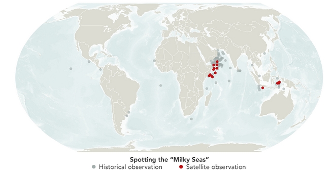 Κατά ένα μεγάλο βαθμό ο Μίλερ βασίστηκε σε μια καθιερωμένη λίστα με γαλακτώδεις θαλάσσιες θεάσεις που συνέταξε ο θαλάσσιος βιολόγος Peter Herring. Ο Μίλερ συγκέντρωσε περισσότερες από 200 αναφορές για λαμπερές θάλασσες που βρέθηκαν σε ιστορικά έγγραφα και αναφορές πλοίων. Βρήκε μια απίθανη αναφορά από τον καπετάνιο του C.S.S. Αλαμπάμα το 1864 στα ανοικτά των ακτών της Σομαλίας η οποία είχε απίστευτη ομοιότητα με το γεγονός του 1995. Χαρτογραφώντας αυτές τις αναφορές από τους δύο τελευταίους αιώνες, ο Miller και οι συνεργάτες του διαπίστωσαν ότι η πλειονότητα προερχόταν από τον βορειοδυτικό Ινδικό Ωκεανό και την Αραβική Θάλασσα, καθώς και από τα ύδατα κοντά στην Ινδονησία και τη Ναυτική Ήπειρο. Σε μια άλλη διαδρομή, ο Miller αντιμετώπισε πολλές προκλήσεις για να προσδιορίσει εάν το αχνό, εφήμερο σήμα των γαλακτωδών θαλασσών θα μπορούσε να ανιχνευθεί από το VIIRS. Η ζώνη ημέρας-νύχτας είναι αρκετά ευαίσθητη ώστε να ανιχνεύει πολλές μορφές νυχτερινού φωτός πάνω και πάνω από τον ωκεανό – συμπεριλαμβανομένων των φώτων από τις βάρκες και των εκλάμψεων αερίου από τις πλατφόρμες γεώτρησης – ακόμα και στον ουρανό – συμπεριλαμβανομένης της λάμψης αέρα και των κυμάτων ατμοσφαιρικής βαρύτητας.