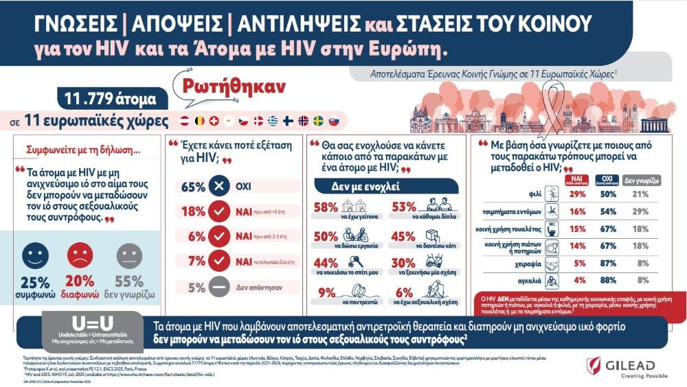 Η Gilead Sciences πραγματοποίησε μία από τις πιο εκτενείς έρευνες κοινής γνώμης στην Ευρώπη, σε 11 χώρες με τη συμμετοχή 11.779 πολιτών. Τα ευρήματα είναι αποκαλυπτικά: παρά τη μεγάλη πρόοδο της επιστήμης, η κοινωνία εξακολουθεί να αντιμετωπίζει τον HIV μέσα από ένα παρωχημένο πρίσμα. Κι αυτό δεν είναι απλώς κοινωνικό πρόβλημα — είναι πρόβλημα δημόσιας πολιτικής.