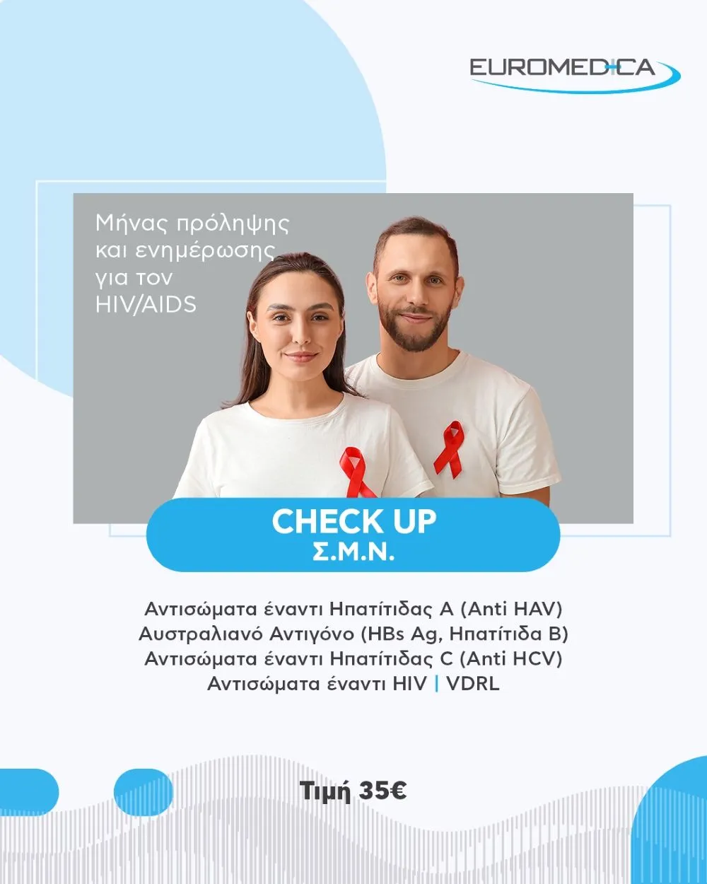Στο πλαίσιο του Προγράμματος Κοινωνικής Ευθύνης, ο όμιλος Euromedica σχεδίασε ένα ειδικό πακέτο Σεξουαλικώς Μεταδιδόμενων Νοσημάτων σε προνομιακή τιμή. Συγκεκριμένα, οι ενδιαφερόμενοι μπορούν να το πραγματοποιήσουν στην ειδική τιμή των 35€, χωρίς να απαιτείται παραπεμπτικό ιατρού!