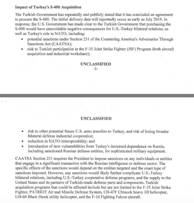 “Η αγορά από την Τουρκία των ρωσικών συστημάτων πυραύλων S-400 θα μπορούσε να οδηγήσει στην πιθανή απομάκρυνση της Άγκυρας από το πρόγραμμα F-35 καθώς επίσης και από την απόκτηση άλλων όπλων, όπως τα ελικόπτερα CH-47F Chinook της Boeing, F-16 της Lockheed Martin και ελικόπτερα UH-60 Black Hawk”, αναφέρει μεταξύ άλλων η έκθεση του Πενταγώνου.