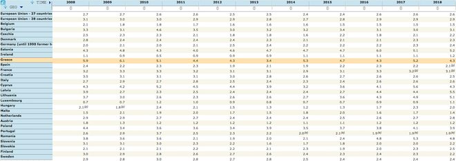 Από τον παρακάτω πίνακα φαίνεται ότι η Ελλάδα ακόμη και μέσα στην δεκατία της ύφεσης διαχρονικά πρωταγωνιστεί στις αμυντικές δαπάνες ως ποσοστό (%) των δαπανών της Γενικής Κυβέρνησης.