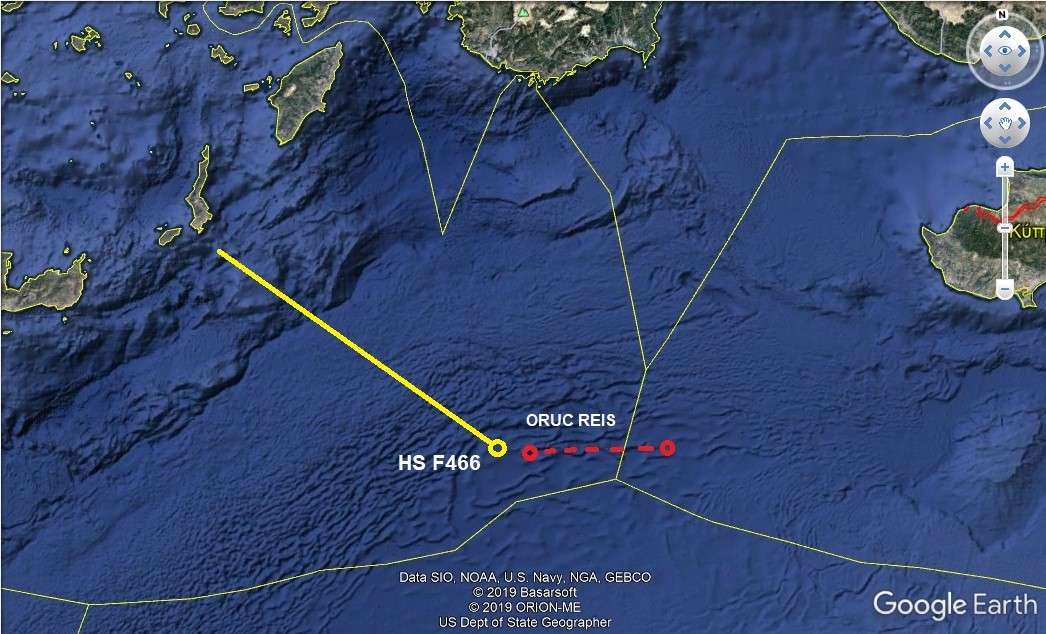 Όπως αναφέρει το militaire.gr, στο χάρτη που έφτιαξε ο Νίκος Τριάντης φαίνεται το στίγμα του τουρκικού ερευνητικού σκάφους Oruc Reis και αυτό της ελληνικής φρεγάτας ΝΙΚΗΦΟΡΟΣ ΦΩΚΑΣ που το παρακολουθεί. Το τουρκικό ερευνητικό βρίσκεται εντός της ελληνικής υφαλοκρηπίδας.