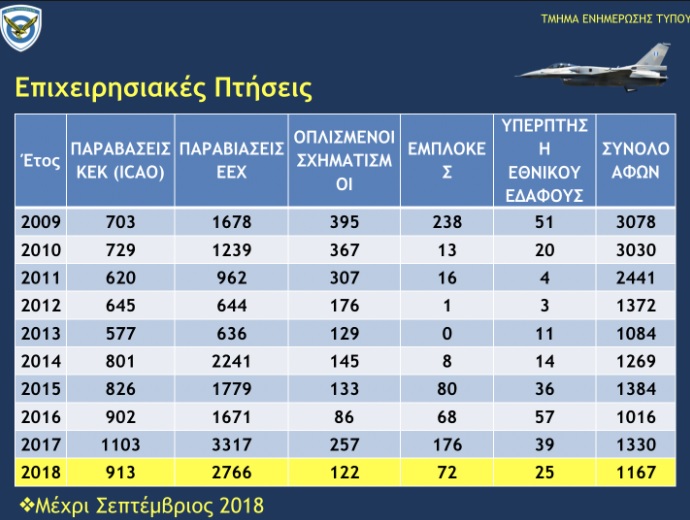 Όπως γράφει το Militaire.gr το νούμερο είναι ασύλληπτο και σίγουρα μοναδικό σ΄ όλο τον πλανήτη! Εξίσου εντυπωσιακοί είναι και οι αριθμοί που αποτυπώνουν την τουρκική επιθετικότητα σε παραβιάσεις, εμπλοκές και υπερπτήσεις. Οι πίνακες είναι από την παρουσίαση που έκανε το ΓΕΑ, με αφορμή τις εκδηλώσεις που θα γίνουν από τις 7 μέχρι τις 11 Νοεμβρίου, για τον προστάτη της Αρχάγγελο Μιχαήλ.