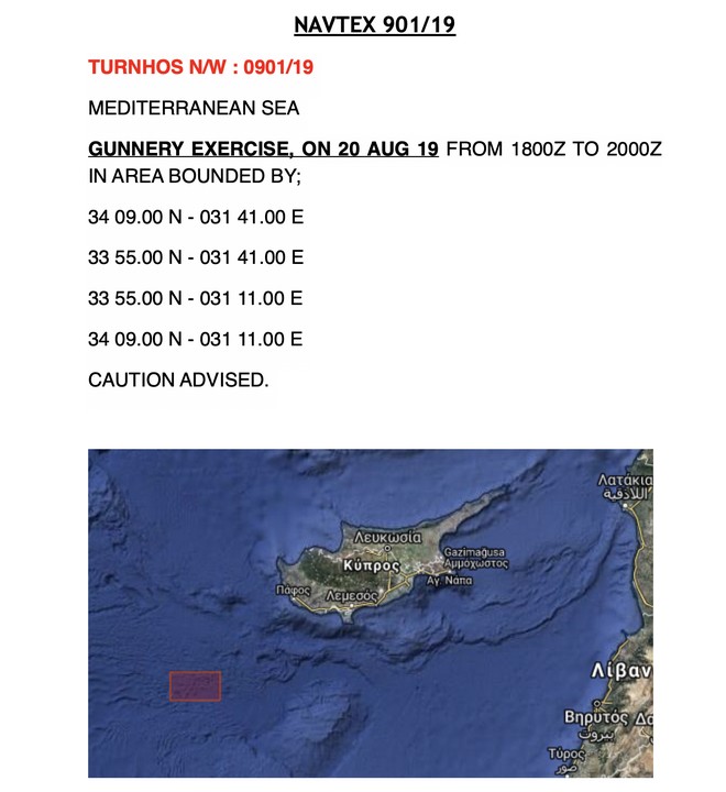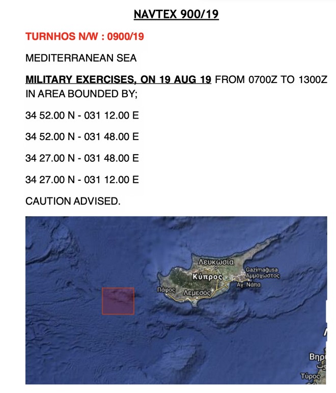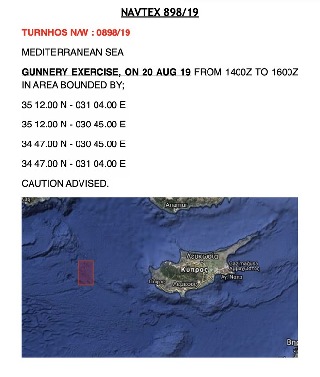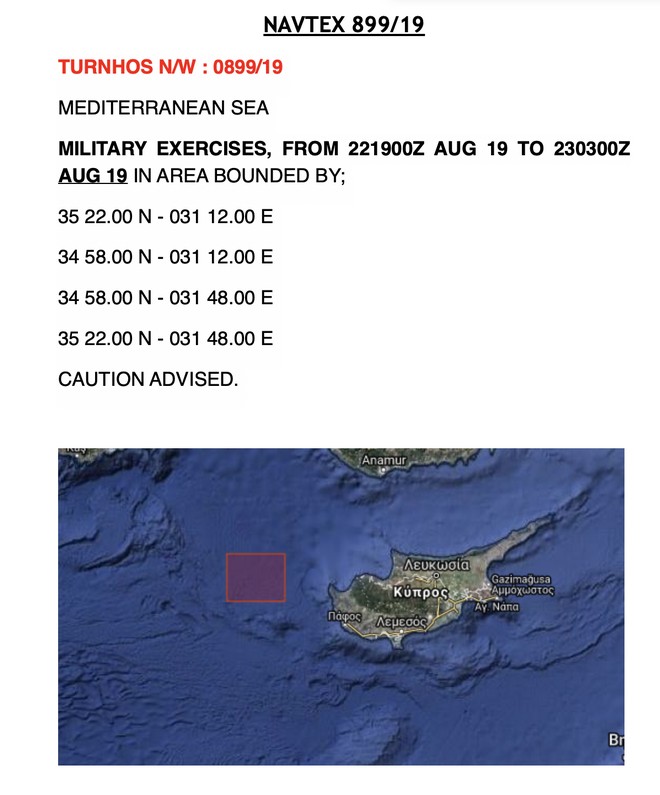 Στις 21 και 22 Αυγούστου οι Τούρκοι δεσμεύουν την περιοχή μεταξύ Ρόδου και Καστελόριζου για ναυτικά γυμνάσια.