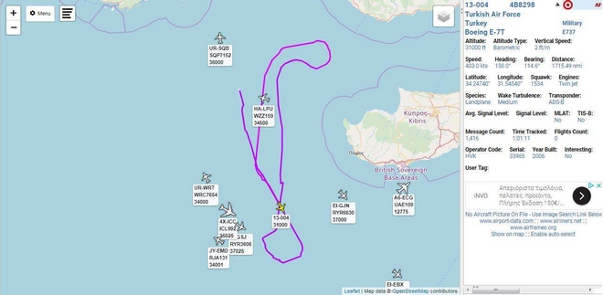 Οι Τούρκοι “επιτηρούν” την Κυπριακή ΑΟΖ και από αέρος. Όπως γράφει ο Νίκος Τριάντης “ένα αεροσκάφος E-7A Wedgetail (Boeing 737-7ES) AEW&C ιπτάμενο ραντάρ με αριθμό 13-004 της Τουρκικής Αεροπορίας πετά σε περιοχές με μεγάλη ένταση και συγκέντρωση πολεμικών πλοίων και πλοίων έρευνας – γεωτρήσεων”.