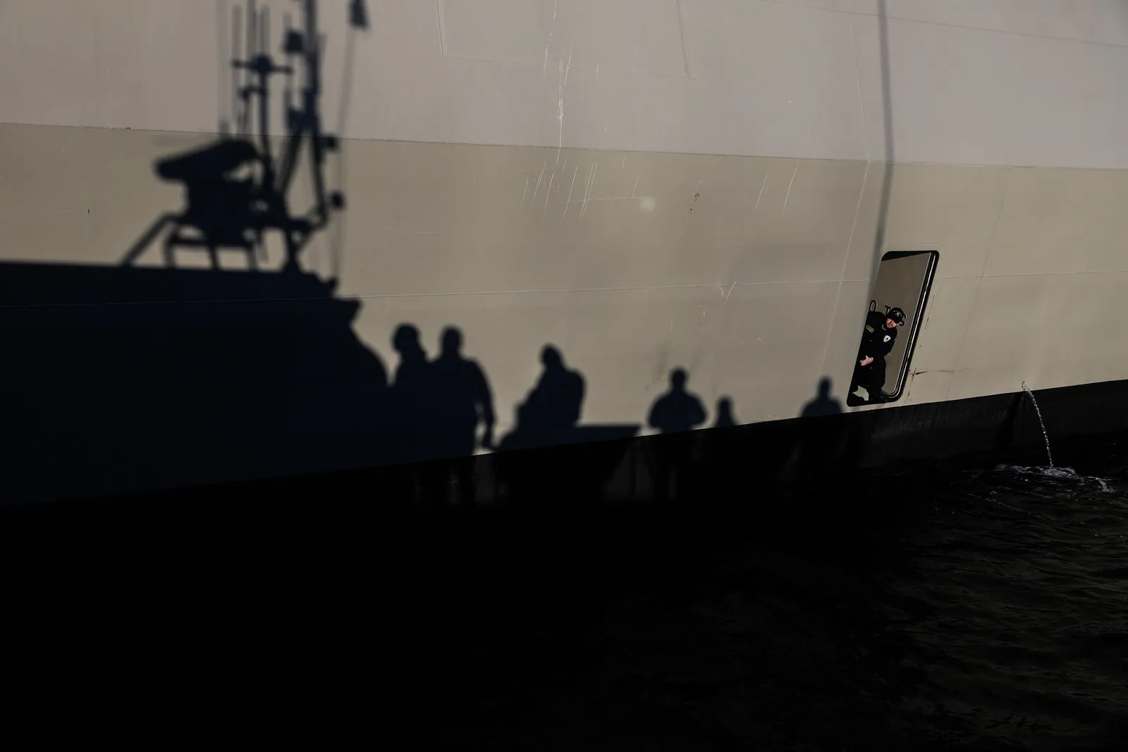 Οι επίσημοι παρακολουθούν τη διέλευση της φρεγάτας “Κίμων” στα ανοιχτά της Αίγινας, κατά τον τελικό πλου προς τον ναύσταθμο της Σαλαμίνας, ανάμεσα από ζεύγη παρατεταγμένων πλοία.