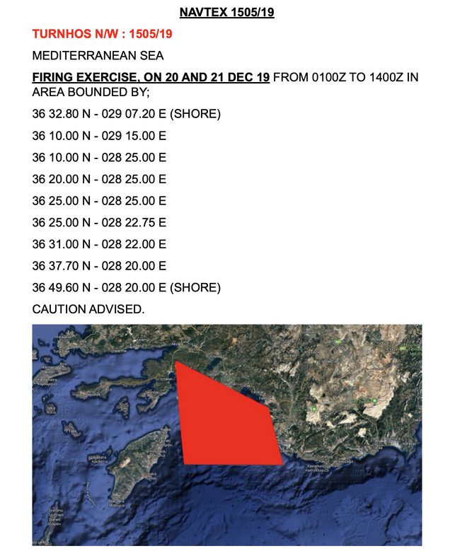 Η νέα NAVTEX, σύμφωνα με τον ΑΝΤ1, που εξέδωσαν οι τουρκικές υδρογραφικές υπηρεσίες και πιο συγκεκριμένα ο υδρογραφικός σταθμός της Σμύρνης, προβλέπει ασκήσεις για βολές με πραγματικά πυρά από την Τετάρτη 18 Δεκεμβρίου και την Πέμπτη 19 Δεκεμβρίου, από τις 4 π.μ μέχρι τις 8 π.μ σε περιοχή ανάμεσα σε Ικαρία, Πάτμο, Φούρνος και Μύκονο.