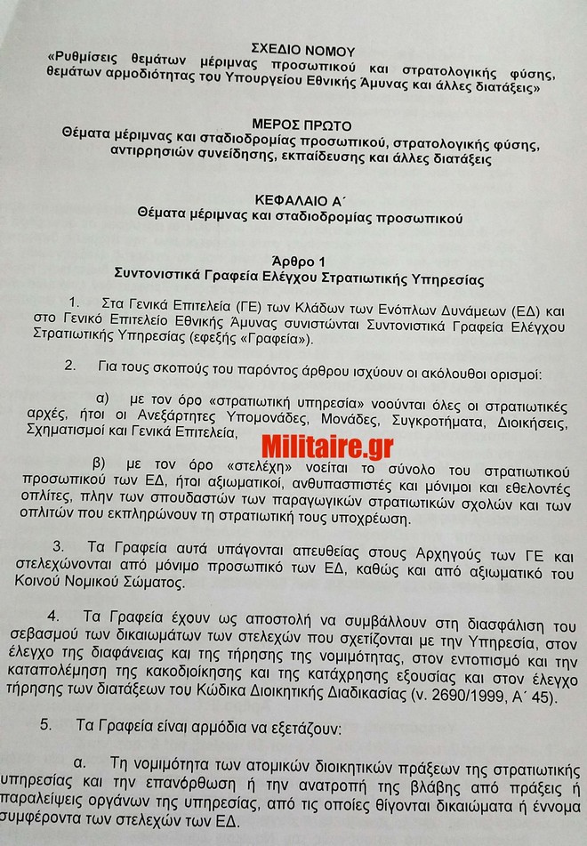 “Στα Γενικά Επιτελεία των Κλάδων Ενόπλων Δυνάμεων και στο ΓΕΕΘΑ, συνιστώνται Συντονιστικά Γραφεία Ελέγχου Στρατιωτικής Υπηρεσίας”.