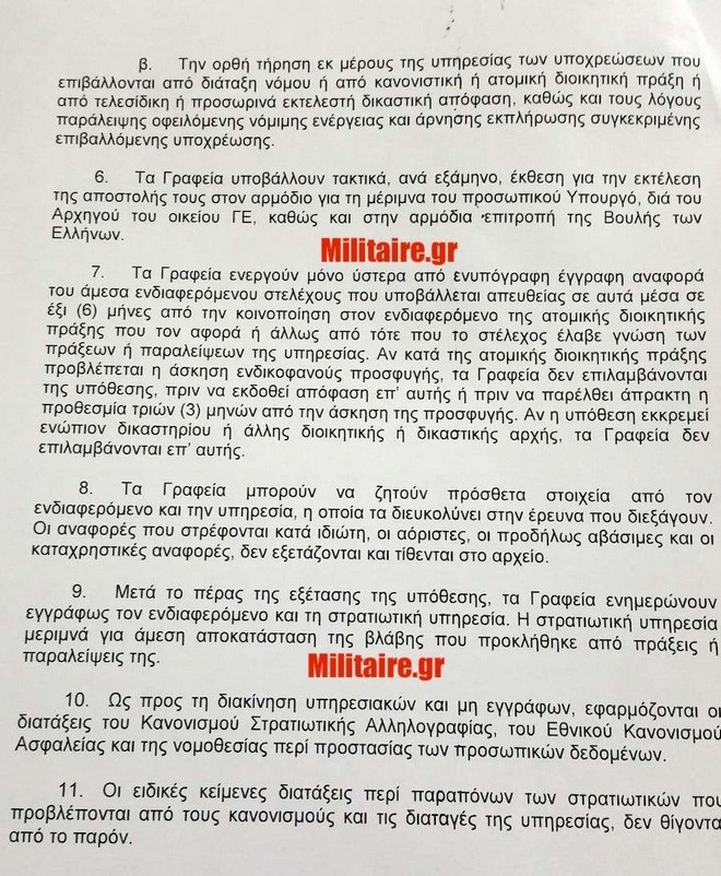 Τι θα κάνουν αυτά τα γραφεία: “…έχουν ως αποστολή να συμβάλλουν στη διασφάλιση του σεβασμού των δικαιωμάτων των στελεχών που σχετίζονται με την Υπηρεσία, στον έλεγχο της διαφάνειας και της τήρησης της νομιμότητας, στον εντοπισμό και την καταπολέμηση της κακοδιοίκησης και της κατάχρησης εξουσίας και στον έλεγχο τήρησης των διατάξεων του Κώδικα Διοικητικής Διαδικασίας (ν.2690/1999, Α’ 45). Υπάρχει λόγος γι΄ αυτή την αποστολή; Έχουμε πάρα πολλές φορές αναφέρει στο Militaire.gr περιπτώσεις στελεχών που έχουν αδικηθεί κατάφωρα. Επιπλέον σε πάρα πολλές περιπτώσεις, δεν επιτρέπεται σε στελέχη που θεωρούν ότι έχουν αδικηθεί, να ασκήσουν τα προβλεπόμενα από το νόμο δικαιώματά τους! Οι περιπτώσεις βέβαια είναι πολλαπλάσιες απ΄ όσες έχουν δει τη δημοσιότητα. Συνεπώς ανάγκη να υπάρξει ένας θεσμικός μηχανισμός με κύρος, μέσω του οποίου θα εξετάζονται τέτοιες περιπτώσεις, υπάρχει.