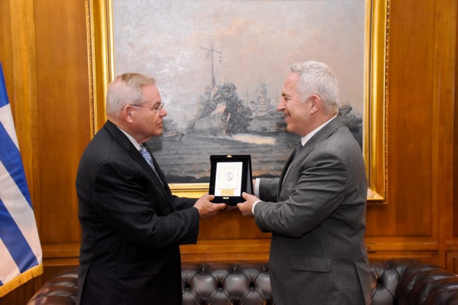 Ο Υπουργός Εθνικής Άμυνας Ευάγγελος Αποστολάκης συναντήθηκε στο γραφείο του με τον Γερουσιαστή Μπομπ Μενέντεζ, επικεφαλής των Δημοκρατικών στην Επιτροπή Εξωτερικών Υποθέσεων της Γερουσίας των ΗΠΑ. Παρών στη συνάντηση ήταν και ο πρέσβης των ΗΠΑ στην Αθήνα Τζ. Πάιατ.