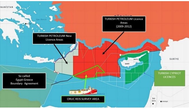 Όπως αναφέρει το τουρκικό πρακτορείο ειδήσεων, Anadolu, το οποίο αναπαράγει το “τιτίβισμα” του Ερτσιγές, στον χάρτη του τουρκικού υπουργείου Εξωτερικών, φαίνεται η δραστηριότητα του ερευνητικού σκάφους Oruc Reis, το οποίο, σύμφωνα με την Άγκυρα, κινείται εντός της τουρκικής υφαλοκρηπίδας και στα όρια της ΑΟΖ στην ανατολική Μεσόγειο.