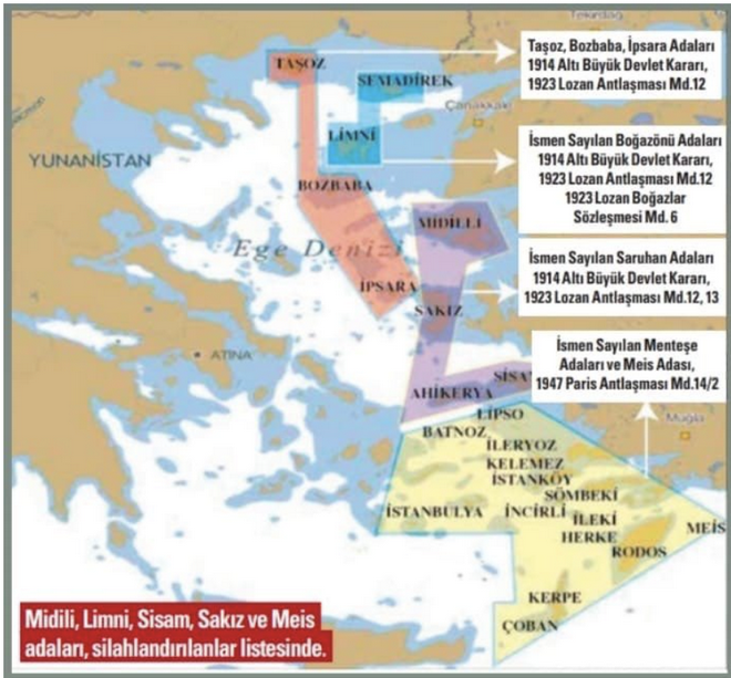 Στο βιβλίο του ο Τούρκος Επιτελάρχης, ο οποίος θεωρείται ο ιθύνων νους για τη εφαρμογή “ΦΕΤΟΜΕΤΡΟ” δηλαδή μια ηλεκτρονική εφαρμογή που κατέγραφε τις κινήσεις στελεχών των ΤΕΔ και τους χαρακτήριζε ως φιλικά ή μη φιλικά προσκείμενους στο κίνημα Γκιουλέν με αποτέλεσμα την φυλάκιση ή την απόταξη χιλιάδων, γράφει ότι στα 23 νησιά (του ανατολικού Αιγαίου, Δωδεκάνησα και Καστελόριζο) τα οποία είχαν δοθεί στην Ελλάδα βάσει της Συνθήκης της Λωζάνης του 1923 και της Συνθήκης των Παρισίων το 1947 , αναγνωρίστηκε καθεστώς αποστρατικοποίησης προκειμένου να προστατευθεί η Τουρκίας από επιθετική ενέργεια της Ελλάδας. Ωστόσο σύμφωνα με τον Τούρκο επιτελάρχη, η Ελλάδα έχει μεταφέρει στρατιωτικές δυνάμεις στα νησιά αυτά με αποτέλεσμα την ακύρωση της προϋπόθεσης βάσει της οποίας έγινε η μεταφορά κυριαρχίας στην Ελλάδα.