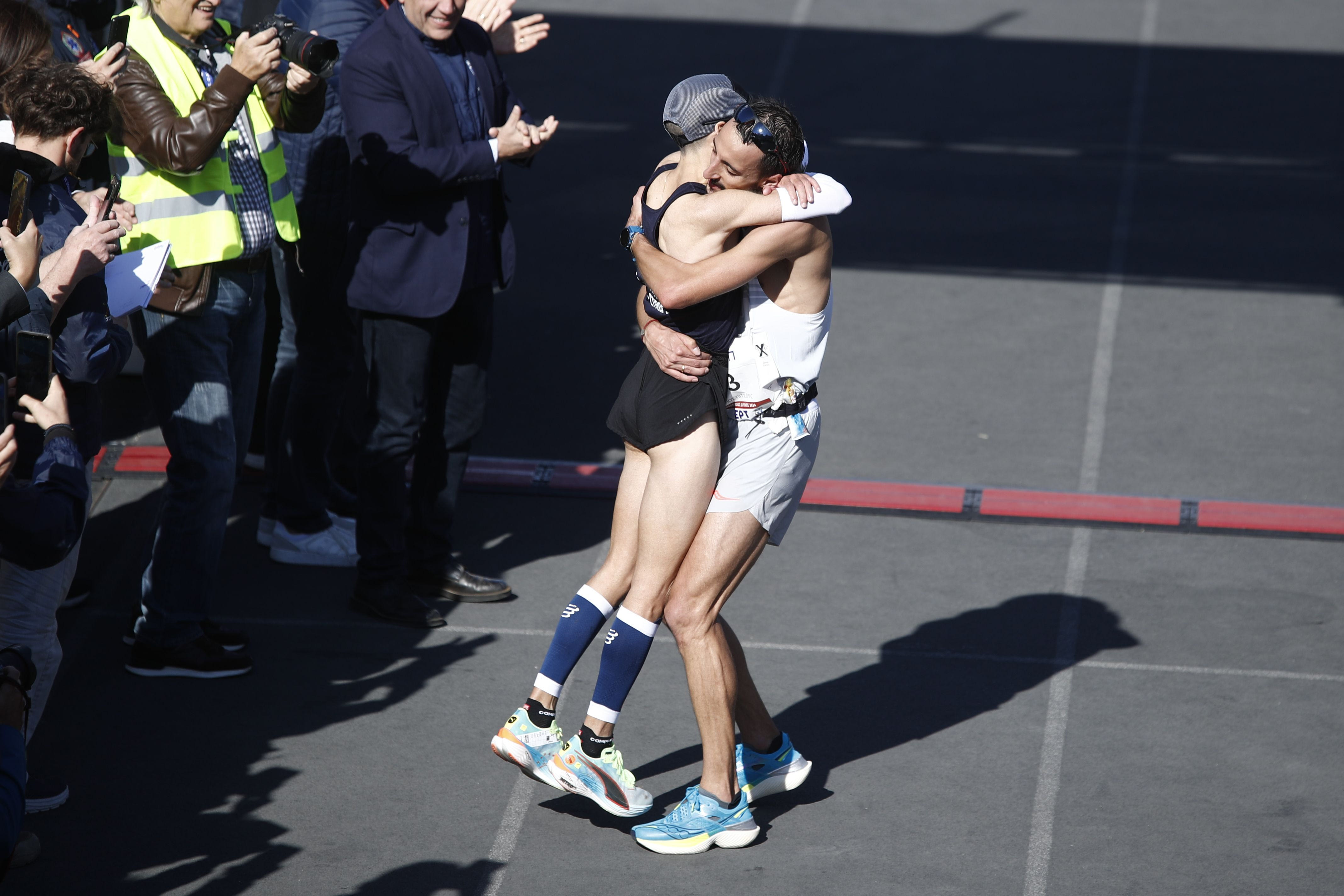 Ο Χαράλαμπος Πιτσώλης, μόλις τερμάτισε, έπεσε στην αγκαλιά της συζύγου και του παιδιού του, ενώ ξεχώρισε η στιγμή που ο δρομέας περιμένει τον Παναγιώτη Καραΐσκο να τερματίσει και τον αγκαλιάζει.