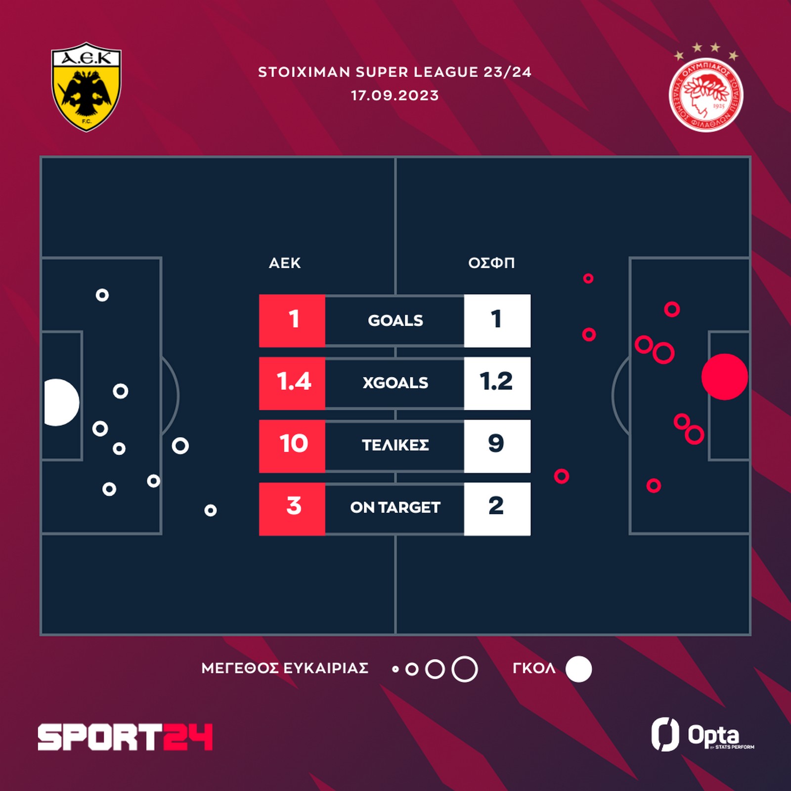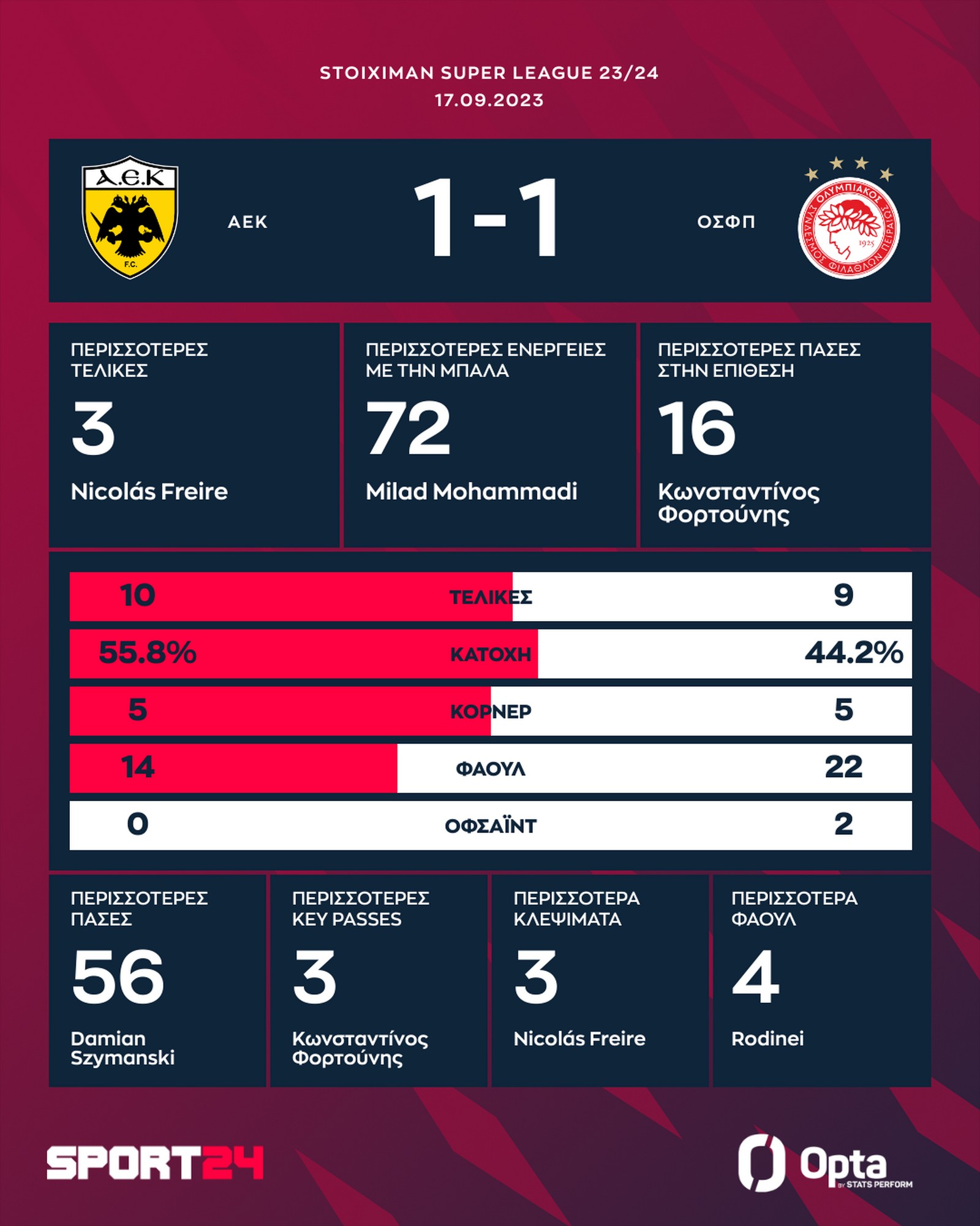 ΑΕΚ και Ολυμπιακός έδωσαν το πρώτο ντέρμπι της χρονιάς στην OPAP Arena και αναδείχθηκαν ισόπαλοι χάρη στους φορ τους. Η Ένωση προηγήθηκε στο 22′ με τον Εσέκιελ Πονσέ και οι Πειραιώτες απάντησαν με τον Ελ Κααμπί στο 38ο λεπτό. Ο αγώνας είχε ρυθμό και ευκαιρίες στο πρώτο μέρος, αλλά στο δεύτερο έπεσε και δεν άλλαξε κάτι στο ματς.