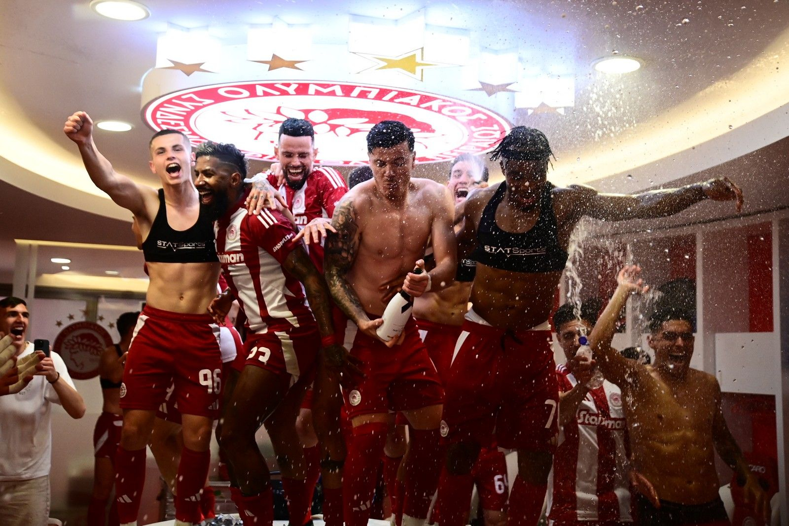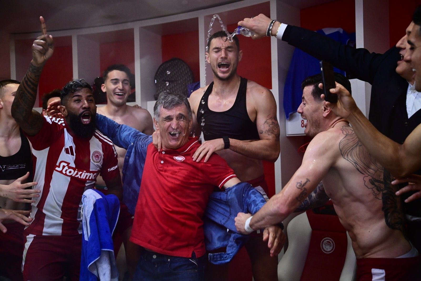 Το 48ο πρωτάθλημα στην ιστορία του Ολυμπιακού, πανηγυρίστηκε άγρια το βράδυ της Κυριακής (13/4) και στα αποδυτήρια του Γεώργιος Καραϊσκάκης.