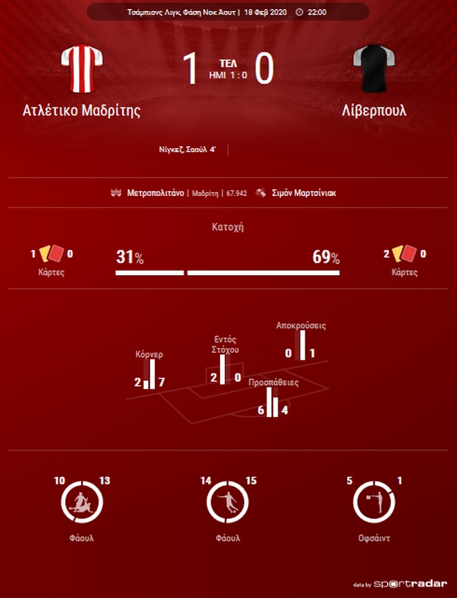 Στο 28ο λεπτό, ο πίνακας της στατιστικής έδειχνε υπεροχή της Λίβερπουλ στην κατοχή μπάλας (67% έναντι 33% της αντιπάλου της), όμως ήταν ανούσια και φλύαρη, κάτι που επιβεβαίωνε το γεγονός πως δεν είχε ούτε μία τελική προσπάθεια στο ματς, σε αντίθεση με την Ατλέτικο που είχε 4, με τις μισές να είναι εντός εστίας.