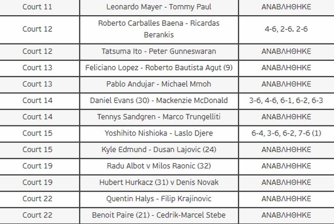 Την ίδια ώρα είχαμε και δύο μίνι εκπλήξεις. Ο Μάρτον Φούκσοβιτς επικράτησε με 3-6, 7-6 (7), 1-6, 6-7 (3) κόντρα στον Ντένις Σαποβάλοφ και ο Σαμ Κιουρέι πέταξε εκτός τον Μπόρνα Τσόριτς με 6-3, 6-4, 6-4.