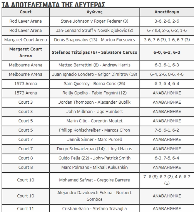 Ο Ρότζερ Φέντερερ και ο Νόβακ Τζόκοβιτς ξεκίνησαν με νίκες την παρουσία τους στο Australian Open. Εκτός συνέχειας οι Σαποβάλοφ και Τσόριτς. Όλα τα αποτελέσματα της Δευτέρας.