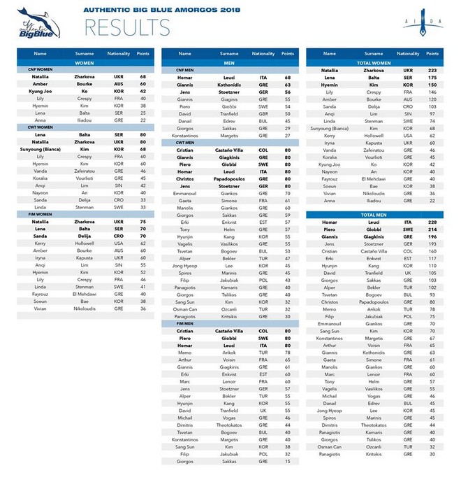 Βάσει των συνολικών επιδόσεών τους, overall νικητές στο 2ο Authentic Big Blue κηρύχθηκαν στους άνδρες ο Homar Leuci που συγκέντρωσε 228 πόντους και η Natalia Zharkova στις γυναίκες συγκεντρώνοντας 223 πόντους. Τη δεύτερη θέση κατέλαβαν οι Pierro Giobbi (214 πόντοι) και Lena Balta (175 πόντοι) και την τρίτη θέση οι Γιάννης Γιαγκίνης (196 πόντοι) και Hyemin Kim (150 πόντοι)