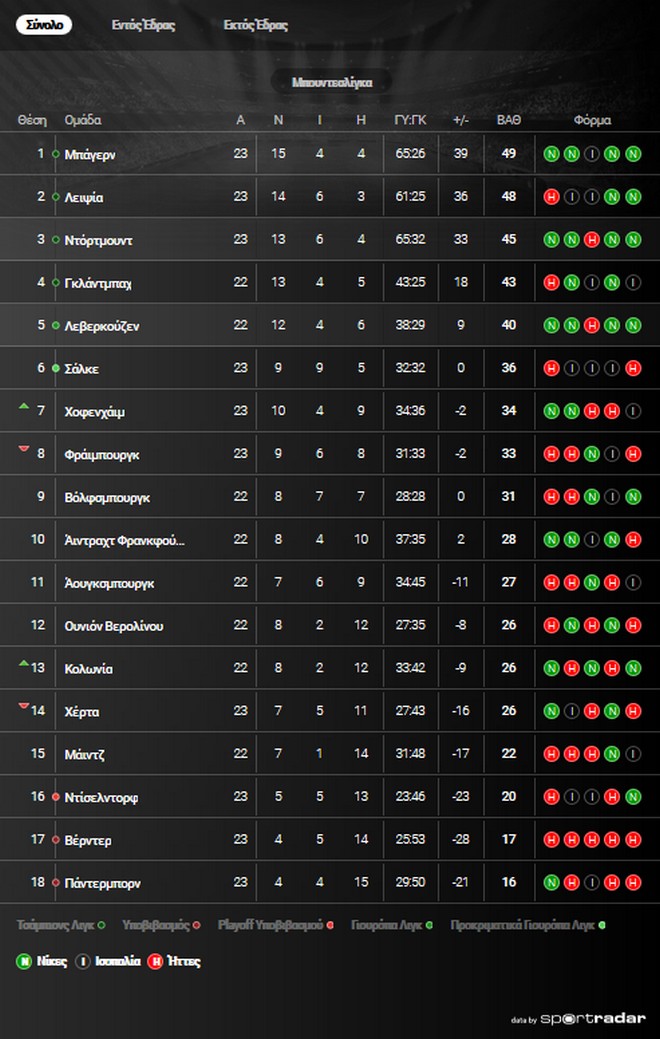 Η Ντόρτμουντ προσπέρασε με την Γκλάντμπαχ, αν και τα πουλάρια έχουν ματς λιγότερο. Ο Γκίντερ άνοιξε το σκορ στο 11ο λεπτό κι ενώ η Γκλάντμπαχ κρατούσε τη νίκη στα χέρια της, ήλθε το σοκ της ισοφάρισης στο 90+2′ από τον Ριμπέιρο και το τελικό 1-1 με τη Χόφενχαϊμ. Η Χέρτα συνεχίζει την απογοητευτική της πορεία και συνετρίβη στο Βερολίνο από την Κολωνία με πεντάρα (0-5).