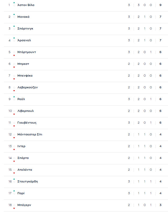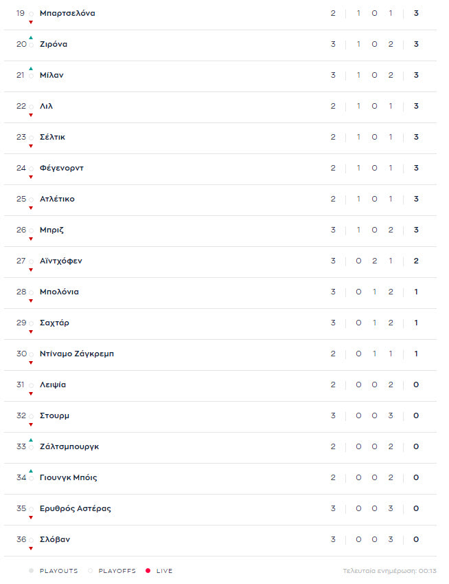 Δείτε πώς διαμορφώθηκε η βαθμολογία της League Phase του Champions League μετά τα παιχνίδια της Τρίτης (22/10) για την 3η αγωνιστική.