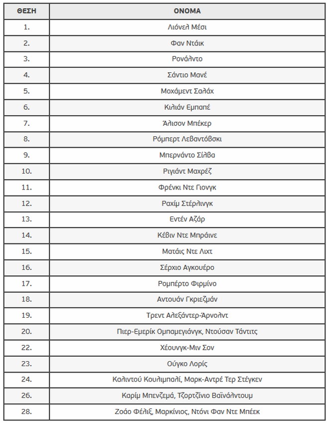 Να σημειώσουμε πως καλύτερος νέος παίκτης αναδείχτηκε ο Ντε Λιχτ ενώ κορυφαίος γκολκίπερ ψηφίστηκε ο Άλισον Μπέκερ.