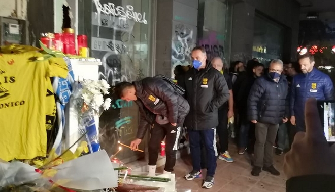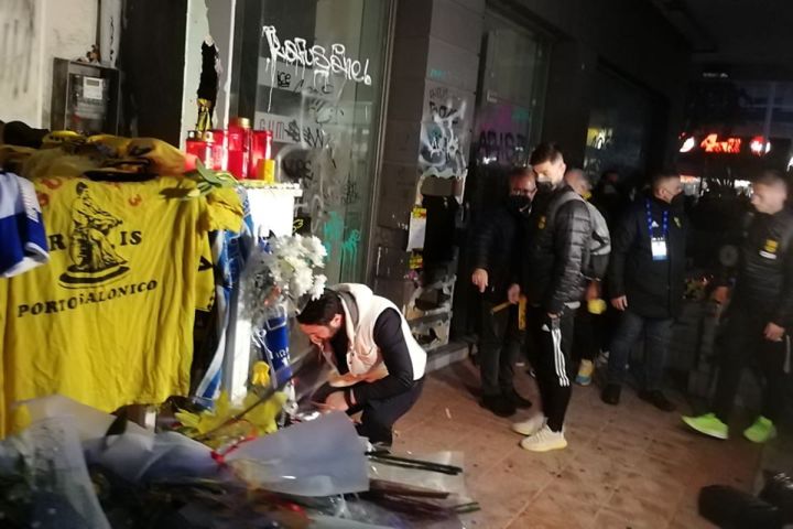 Σύσσωμη η ομάδα των “κιτρίνων” άφησαν λίγα λουλούδια στο πεζοδρόμιο, το οποίο είχε γεμίσει με ανθοδέσμες, κασκόλ και φανέλες του Άρη, της ομάδας που υποστήριζε ο νεαρός φίλαθλος.