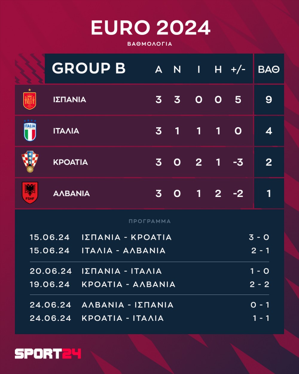 Συγκεκριμένα, όπως γράφει το SPORT24, η Ισπανία καταλαμβάνει την πρώτη θέση, η Ιταλία τη δεύτερη, αφήνοντας τη Κροατία στην 3η θέση, μέσω της οποίας θα χρειαστεί να παλέψει για το εισιτήριο της πρόκρισης, ενώ η Αλβανία τερμάτισε 4η και αποχαιρετά το Euro.