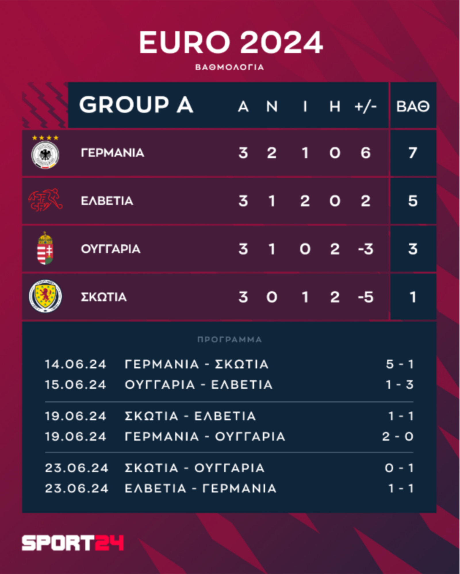 Δείτε την τελική κατάταξη των ομάδων του πρώτου ομίλου του Euro 2024, μετά την ολοκλήρωση της τρίτης αγωνιστικής
