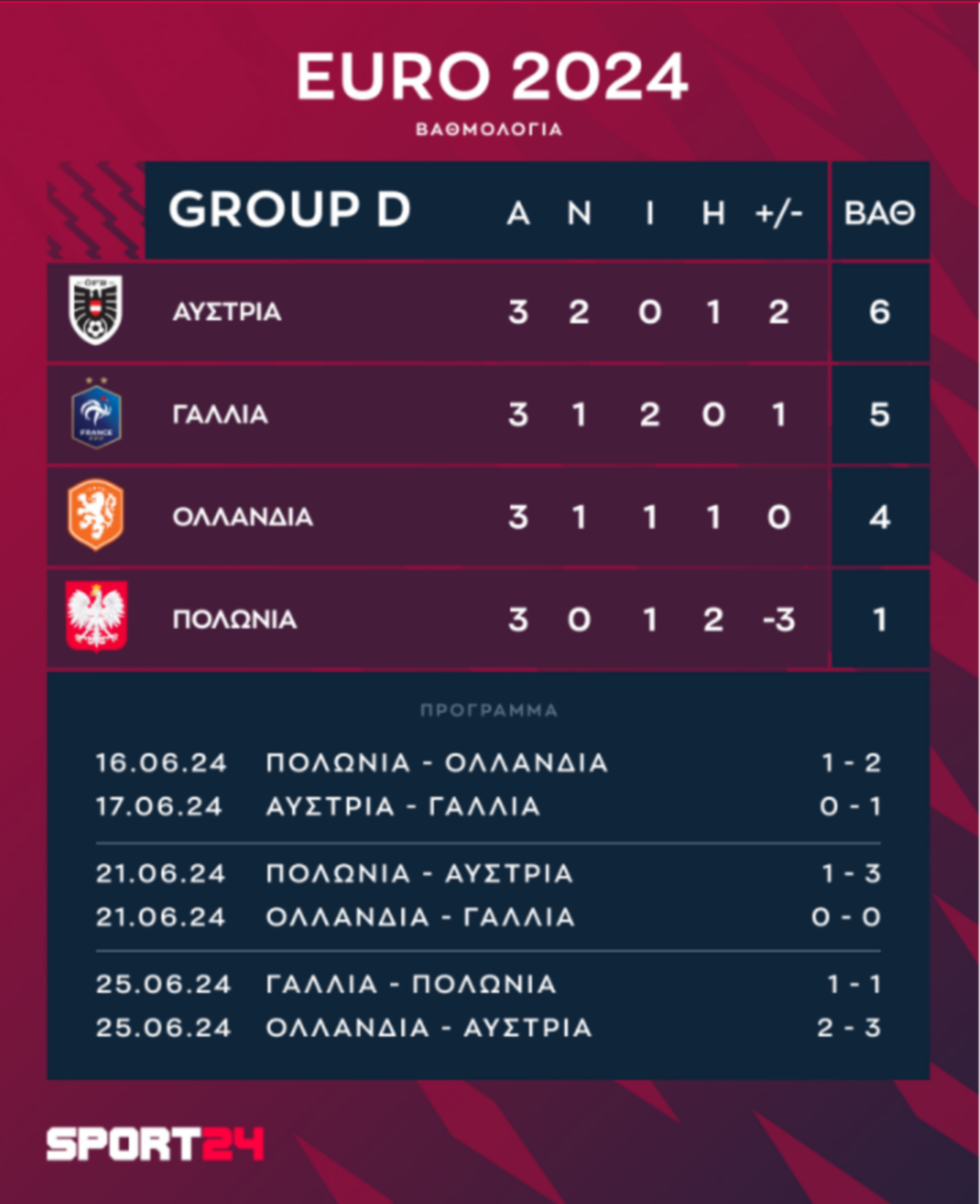 Συγκεκριμένα, όπως αναφέρει και το SPORT24, η Αυστρία καταλαμβάνει την πρώτη θέση, η Γαλλία τη δεύτερη, αφήνοντας την Ολλανδία στην τρίτη θέση μέσω της οποίας θα χρειαστεί να παλέψει για το εισιτήριο της πρόκρισης, ενώ η Πολωνία αποχαιρέτησε το Euro ως τέταρτη.