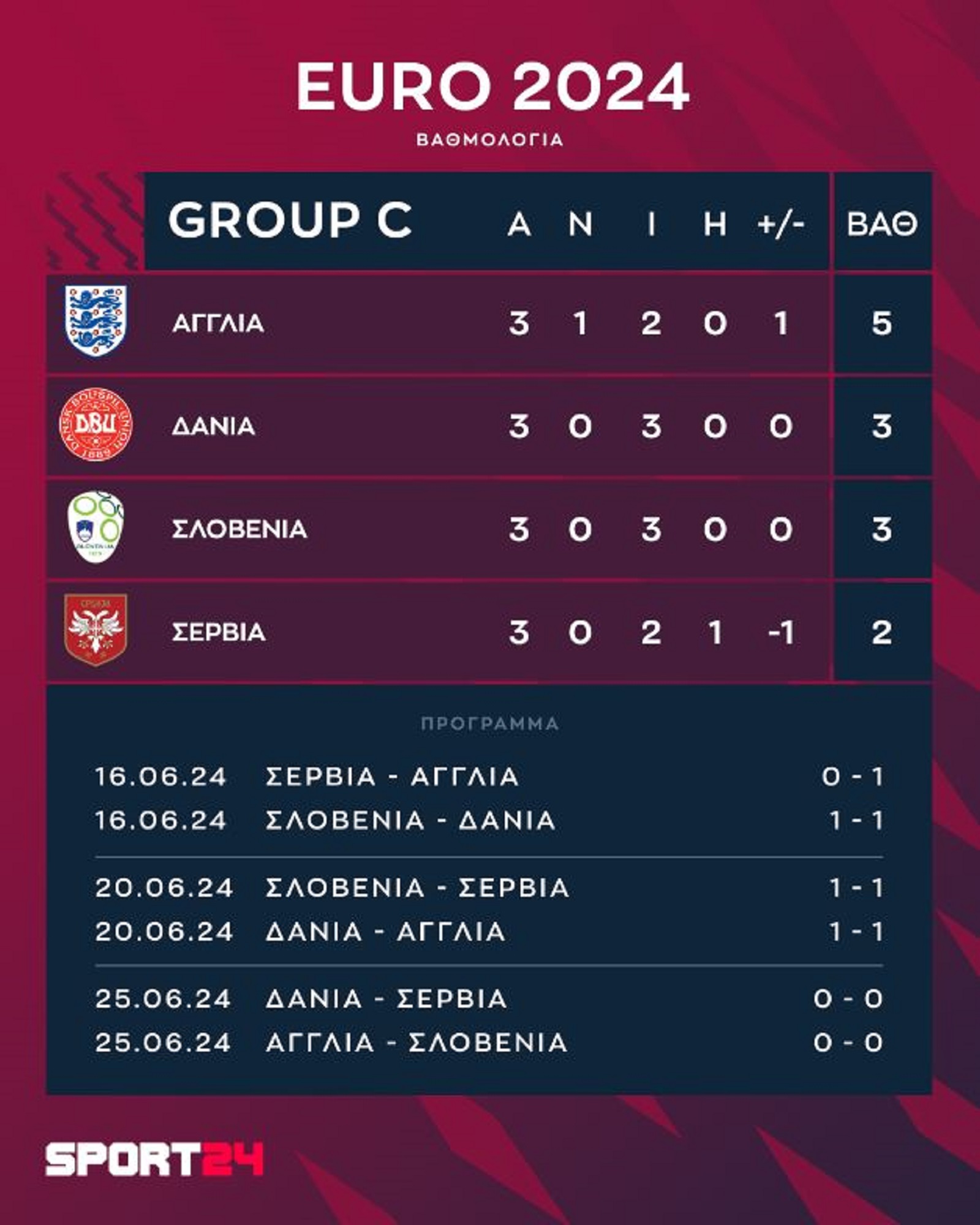 Ολοκληρώθηκε και ο τρίτος όμιλος του Euro 2024, με τις αναμετρήσεις Αγγλία – Σλοβενία και Δανία – Σερβία να λήγουν 0-0.
