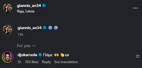 Ο Νόλε, που μετά τον αποκλεισμό του από το US Open ήρθε απευθείας στην Αθήνα, σχολίασε στο τελευταίο post του Γιάννη Αντετοκούνμπο: “Πάμε” και φυσικά έχει πάρει τα περισσότερα likes από τα υπόλοιπα σχόλια.
