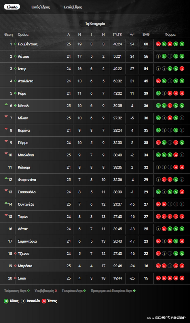 Η Μίλαν ισοβαθμεί με τη Νάπολι στους 36 βαθμούς, υστερεί από τους παρτενοπέι στην ισοβαθμία και έχασε έδαφος.