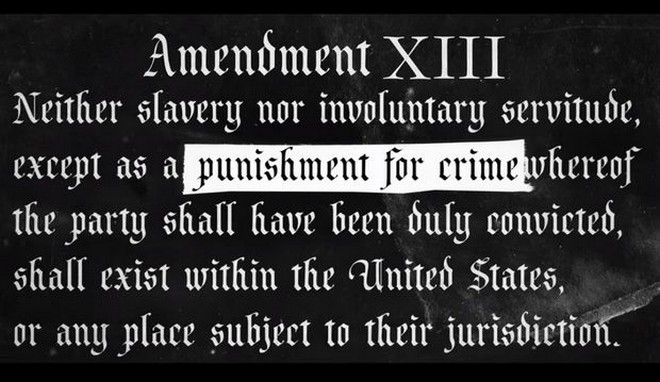 Μέχρι και σήμερα μπορείτε να διαβάσετε πως “ ούτε η δουλεία, μηδέ η καταναγκαστική εργασία -εκτός της τιμωρίας για εγκλήματα για τα οποία ένας άνθρωπος έχει καταδικαστεί- πρέπει να υπάρχουν μέσα στις ΗΠΑ ή σε όποιο άλλο μέρος υπάγεται στη δικαιοδοσία τους”. Η φράση που πρέπει να κρατήσετε είναι αυτή ανάμεσα στις παύλες. Αυτή επιτρέπει στις αμερικανικές φυλακές να αναγκάζουν τους κρατούμενους να κάνουν όποια δουλειά επιθυμούν οι διοικήσεις ή ό,τι άλλο κρίνουν πως χρειάζεται να γίνει.