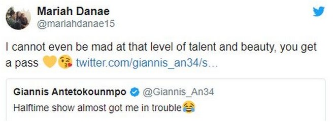 Με τον Γιάννη Αντετοκούνμπο να γράφει αστειευόμενος ότι το σόου των Σακίρα-Τζένιφερ Λόπεζ στο Super Bowl πήγε να τον βάλει σε μπελάδες, η σύντροφός του τον συγχώρεσε μέσω twitter!